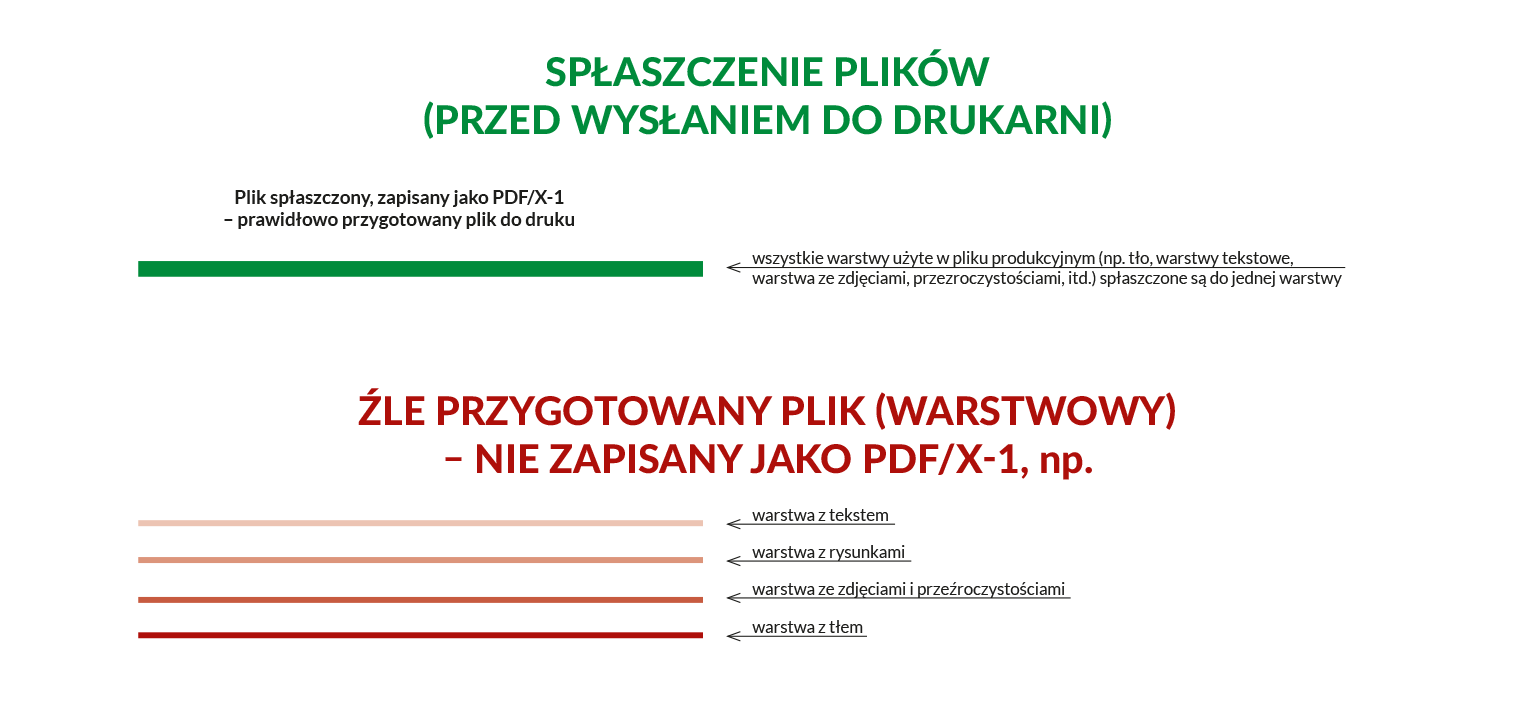 Spłaszczenie pliku (ang. flattening) oznacza połączenie wszystkich warstw, przezroczystości oraz efektów wizualnych w jeden, jednolity obraz. Dzięki temu plik PDF staje się technicznie prostszy i bardziej stabilny, co ułatwia jego prawidłowe odczytanie przez RIPy maszyn drukarskich. W przypadku plików z wieloma warstwami lub złożonymi efektami, takie jak cienie czy przezroczystości, może dochodzić do błędów podczas drukowania, na przykład do zmiany kolorów, znikania elementów czy niepoprawnego odwzorowania cieni. Spłaszczenie minimalizuje te problemy, zapewniając, że wszystkie elementy grafiki zostaną wydrukowane dokładnie tak, jak zostały zaprojektowane.